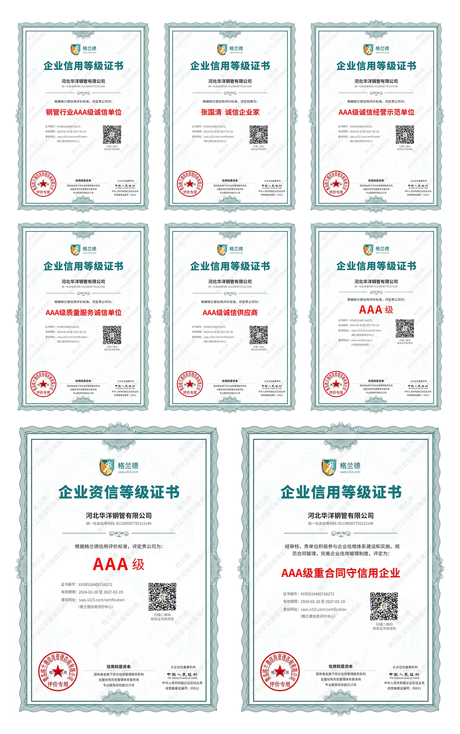 為了進(jìn)一步證明我們的誠信經(jīng)營成果,華洋鋼管收獲了眾多含金量極高的誠信證書。這些證書不僅是對我們過往努力的認(rèn)可,更是我們未來繼續(xù)前行的動力。