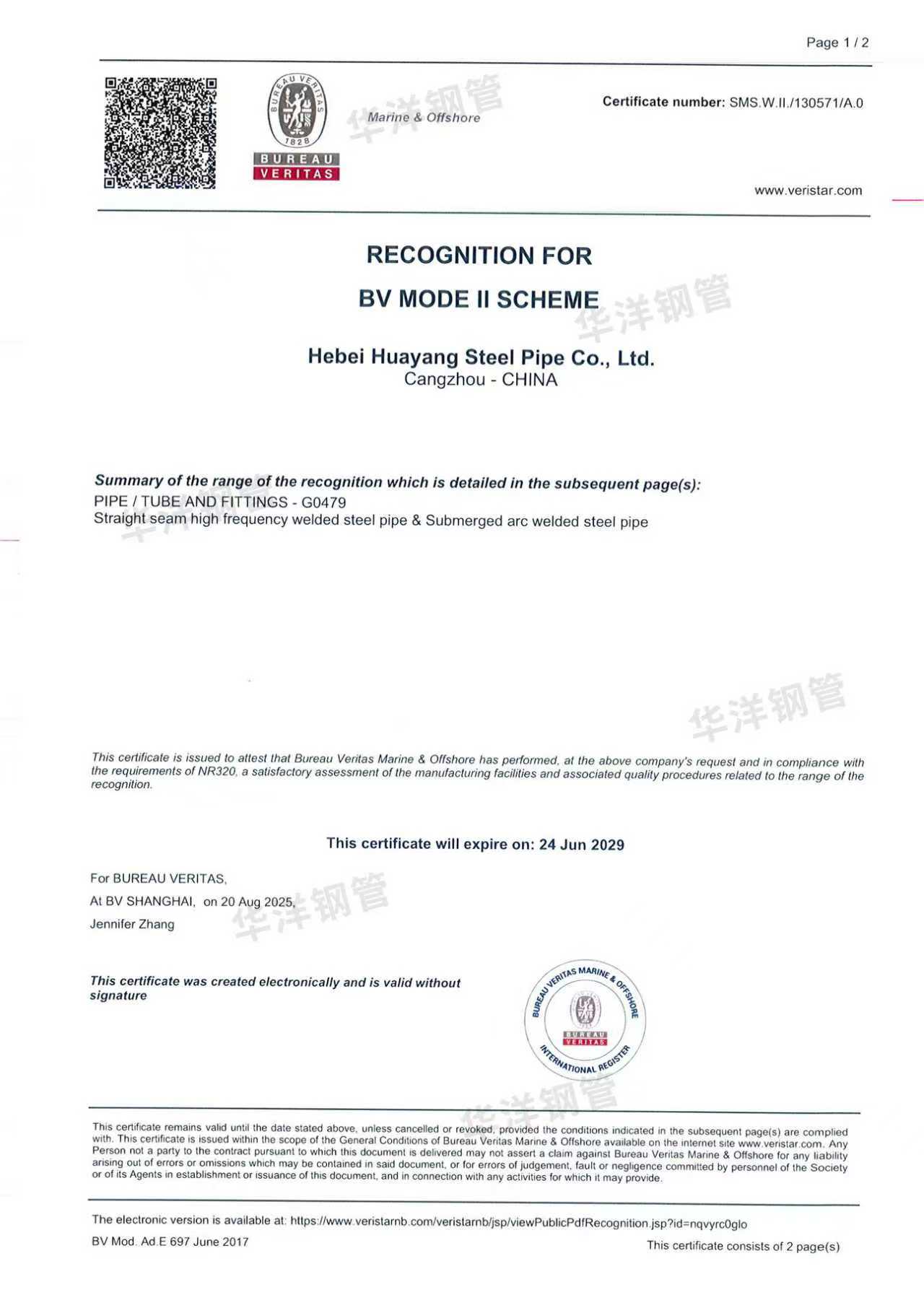 近日,華洋鋼管成功獲得 法國(guó)船級(jí)社(Bureau Veritas,BV)工廠認(rèn)證。這一認(rèn)證不僅象征著產(chǎn)品品質(zhì)與制造能力得到全球權(quán)威機(jī)構(gòu)的認(rèn)可,更標(biāo)志著華洋鋼管具備進(jìn)入船舶、海工、能源等高標(biāo)準(zhǔn)國(guó)際工程領(lǐng)域的能力,是公司國(guó)際化戰(zhàn)略中的重要里程碑。